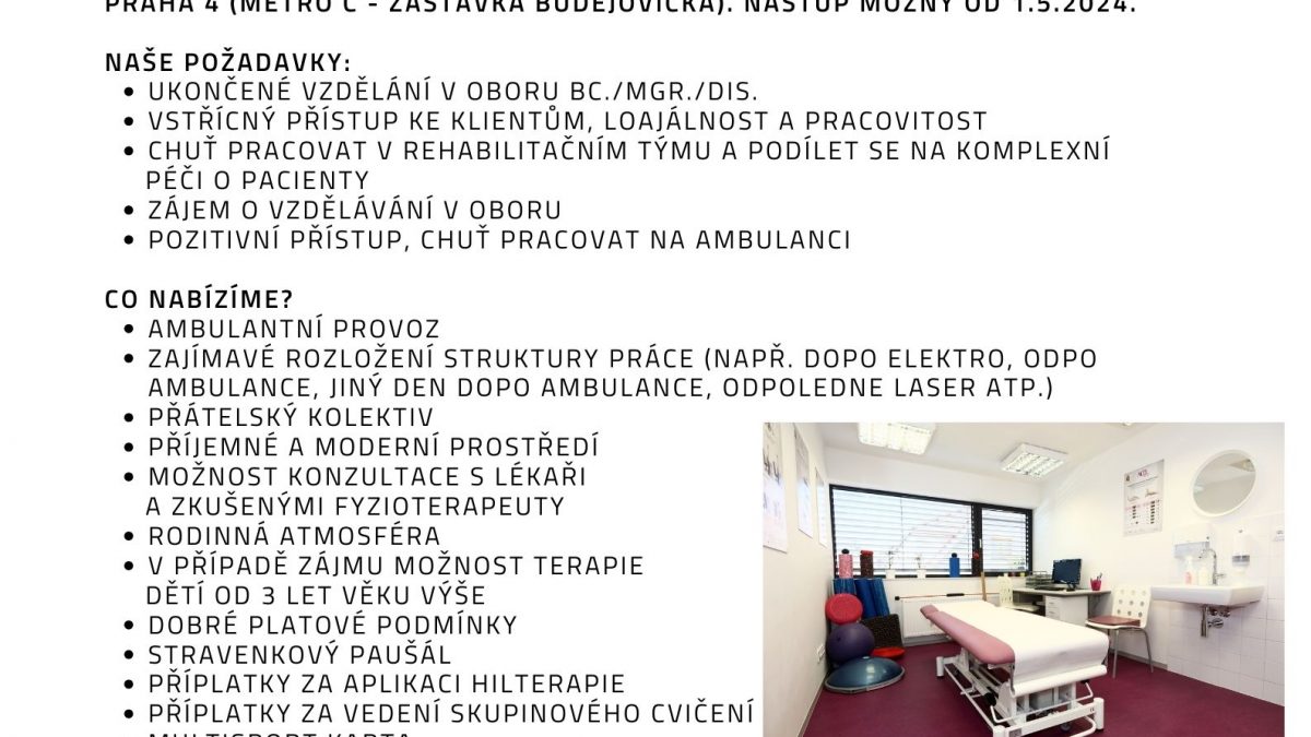 Rádi bychom mezi sebou přivítali kolegu, který ví, že ambulance ho bude bavit, ocení, že např. dopo bude mít ambulanci, odpoledne elektro nebo Hilterapii, se bude cítit dobře v malém rodinném kolektivu a bude mít zájem se aktivně podílet na zlepšování svých dovedností.